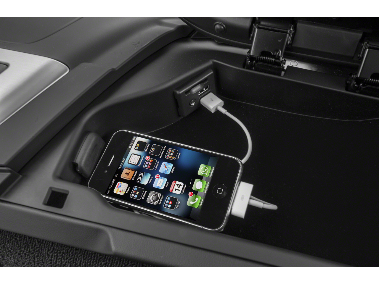 - Console, floor 2 covered cup holders, auxiliary power outlet, USB ports, SD card slot, auxiliary input jack and storage